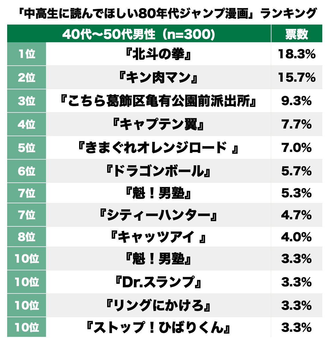 ここ最近では『鬼滅の刃』や『呪術廻戦』など、『週刊少年ジャンプ』(集英社)の漫画が話題を集めているが、忘れてはいけないのが80年代黄金期のジャンプ漫画だ。今なお、色あせないセンスに、きっと時間を忘れて没頭できるはず。そこで今回は、40代~50代の男性300人を対象に、「今の中高生にも読んでほしい80年代のジャンプ漫画」についてアンケートを行った。さっそくランキング形式で、リサーチの結果を紹介していきたい。(アンケートサイト「ボイスノート」協力)