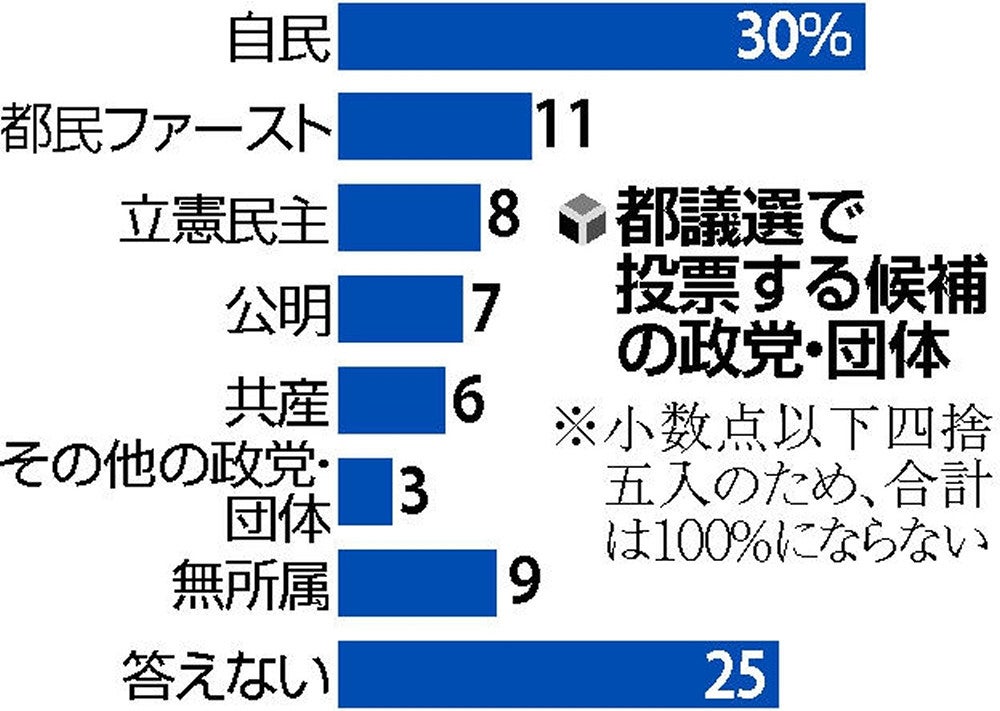 政党別の投票先では、自民党が最多の30%で、都議会第1党の地域政党「都民ファーストの会」は11%にとどまった。立憲民主党は8%、公明党は7%、共産党は6%で、無回答は25%だった。